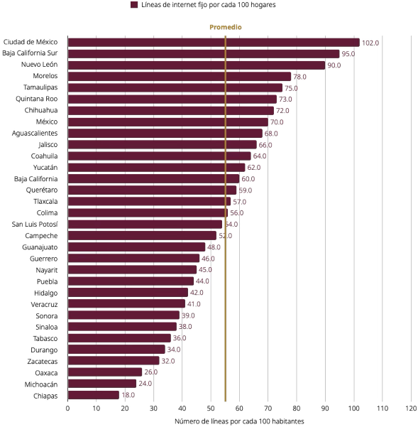 Nota: La conectividad fija a internet muestra fuertes disparidades territoriales: entidades como Ciudad de México, Nuevo León y Baja California Sur superan los 90 accesos, mientras que Oaxaca, Chiapas y Guerrero reportan menos de 30. Este patrón evidencia una brecha estructural entre regiones centro-norte y sur-sureste, así como entre zonas urbanas y rurales. La falta de infraestructura de conectividad fija limita el acceso a servicios de educación, salud, trabajo remoto y participación ciudadana. Se deberá integrar esta dimensión como un componente de la infraestructura habilitante territorial y la reducción de desigualdades territoriales), promoviendo inversiones regionalmente equilibradas y articuladas con redes intermodales, nodos digitales y justicia digital para el bienestar.