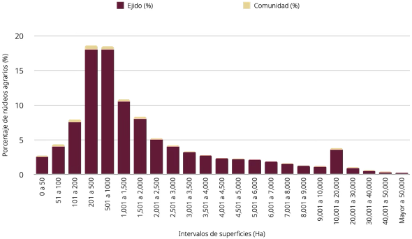 2,500 hectáreas, donde se agrupan más de 50% de los ejidos y comunidades. Sin embargo, las comunidades tienden a concentrarse proporcionalmente más en superficies mayores a 10,000 hectáreas. Esta configuración tiene implicaciones clave para el ordenamiento y desarrollo territorial: los núcleos de menor tamaño enfrentan mayores limitaciones para el aprovechamiento productivo, la gestión ambiental y la dotación de infraestructura; en tanto que las grandes extensiones comunales, particularmente en regiones con presencia indígena, concentran funciones ambientales estratégicas (bosques, selvas, recarga hídrica). Se deberá proponer estrategias diferenciadas para atender estas condiciones, articulando seguridad jurídica, capacidades de gobernanza territorial y justicia agraria, así como restauración y protección de bienes comunes.