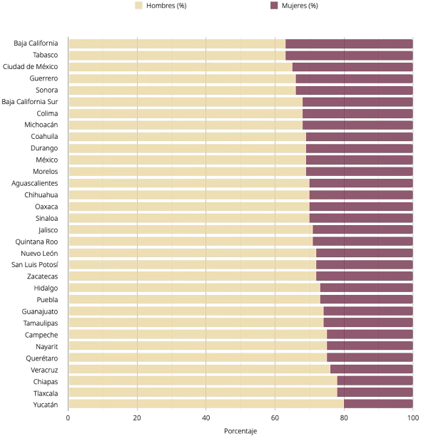 Nota: La participación de las mujeres como sujetas agrarias continúa siendo marcadamente desigual en todo el país. En ningún estado las mujeres superan 30 % del total de personas reconocidas como integrantes de núcleos agrarios. Esta disparidad refleja patrones estructurales de exclusión en el acceso a derechos sobre la tierra, con implicaciones para la titularidad, la toma de decisiones y el acceso a programas públicos. Las brechas son más amplias en entidades con alta densidad rural y presencia indígena.