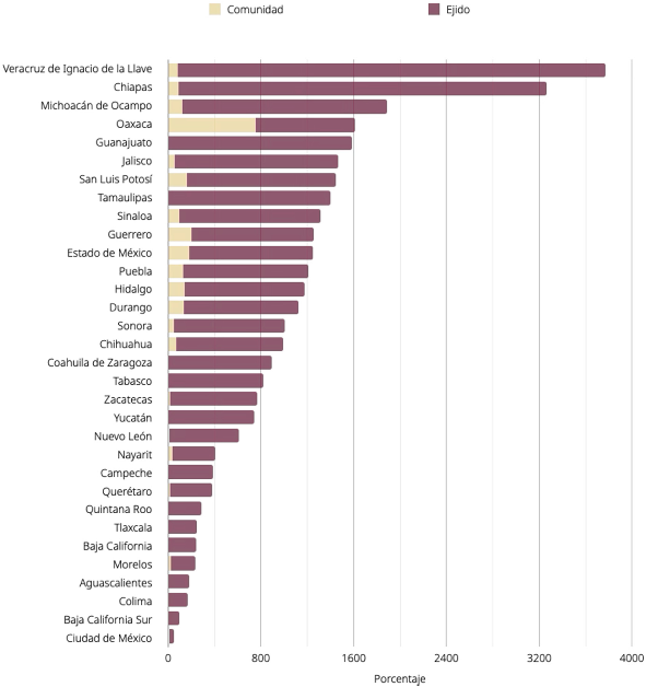 Nota: En 2024, México cuenta con 32,251 núcleos agrarios, de los cuales el 92.5% son ejidos y el 7.5% comunidades. Entidades como Veracruz, Oaxaca, Chiapas y Michoacán concentran la mayor cantidad, reflejando la centralidad de la propiedad social en el ordenamiento del territorio nacional. Esta configuración plantea desafíos estructurales para la gobernanza del suelo, el acceso equitativo a derechos agrarios y la planeación participativa. Estos datos sustentan la necesidad de fortalecer capacidades institucionales, garantizar la seguridad jurídica y articular los núcleos agrarios con estrategias de desarrollo territorial con justicia social y ambiental.