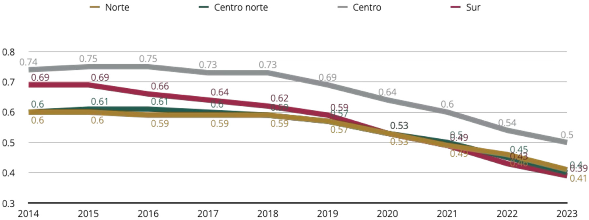 10 Más información, ver: Cuadro 21. Participación estatal en el PIB nacional por sector económico (2023); Cuadro 23. Evolución de la dispersión salarial por región (2014-2023); y Cuadro 24. Evolución del índice de Gini por región (2018-2022).
