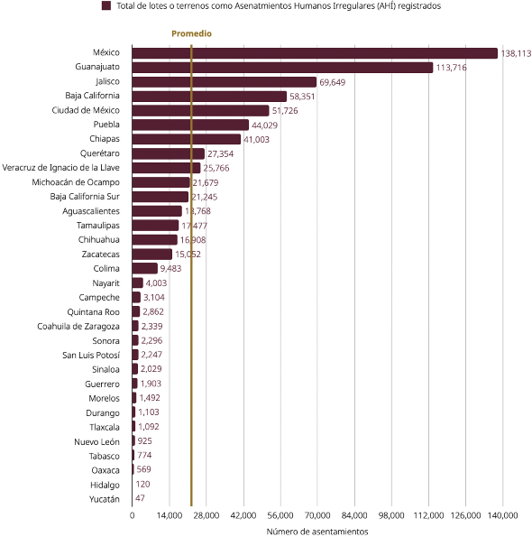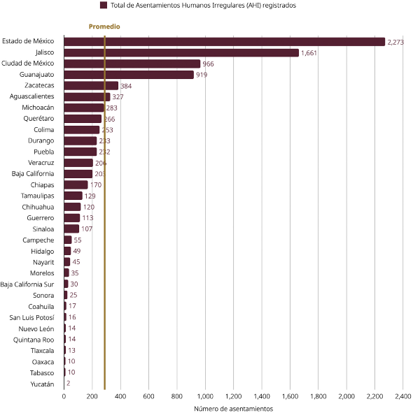 19 Más información, ver: Cuadro 11. Distribución estatal de municipios con asentamientos humanos irregulares registrados (2023); Cuadro 08. Distribución de la población por entidad federativa y grado de marginación (2020); Cuadro 10. Distribución de las AGEB urbanas por entidad federativa y nivel de marginación (2020); Cuadro 16. Evolución de títulos de propiedad y dominio pleno en el sector agrario por periodo (1989-2024); Gráfico 20. Superficie de Asentamientos Humanos Irregulares reportados por entidad federativa (2023); Mapa 05. Cobertura de Instrumentos de Ordenamiento Territorial en México (2024).