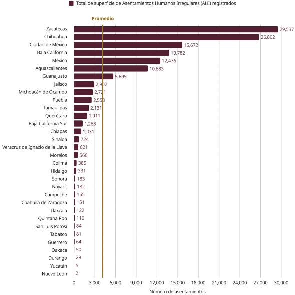 Nota: La superficie total reportada de Asentamientos Humanos Irregulares (AHI) por entidad federativa revela una fuerte concentración territorial: Zacatecas, Chihuahua, CDMX, Baja California, México, Aguascalientes y Guanajuato concentran más de 85% de los más de 130,000 hectáreas registradas a nivel nacional. Sin embargo, esta información no refleja con precisión la magnitud real del fenómeno debido a un subregistro sistémico: en promedio, solo el 13.5 % de los municipios de cada entidad federativa han reportado información sobre AHI. Esta omisión evidencia deficiencias estructurales en los sistemas estatales y municipales de información territorial, así como en la interoperabilidad catastral, el monitoreo de la ocupación del suelo y la regularización.
