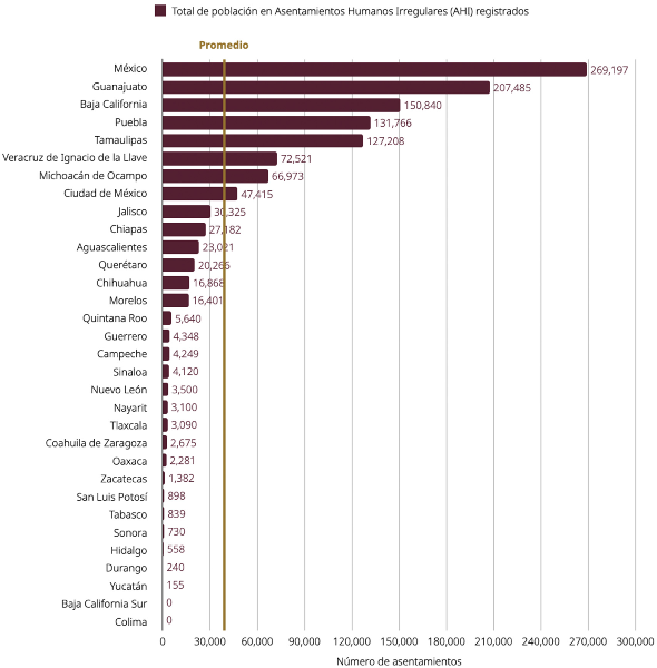Nota: La población reportada en Asentamientos Humanos Irregulares (AHI) asciende a más de 1.9 millones de personas, concentradas sobre todo en México, Guanajuato, Baja California, Puebla y Tamaulipas, entidades que en conjunto agrupan casi 60 % del total nacional. Sin embargo, estos datos deben interpretarse con cautela, pues reflejan solo lo registrado en el 13.5 % de los municipios, según los informes estatales de 2023. El subregistro es estructural y encubre la magnitud real del fenómeno, particularmente en zonas rurales, periurbanas y fronterizas. Esta invisibilidad estadística afecta el diseño de políticas públicas, la planeación territorial y la garantía del derecho a una vivienda adecuada.