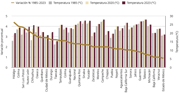 Nota: En el periodo 1985-2023, la temperatura media anual en México muestra una tendencia ascendente sostenida, con un incremento acumulado de más de 1°C, y variaciones diferenciadas entre entidades federativas. Este comportamiento confirma un patrón inequívoco de cambio climático, con implicaciones directas en el ordenamiento territorial, los patrones de urbanización, la disponibilidad hídrica y el riesgo de desastres. El incremento térmico afecta de forma más intensa a regiones del norte y altiplano, lo cual exige estrategias diferenciadas de resiliencia territorial, infraestructura adaptativa y restauración de ecosistemas.