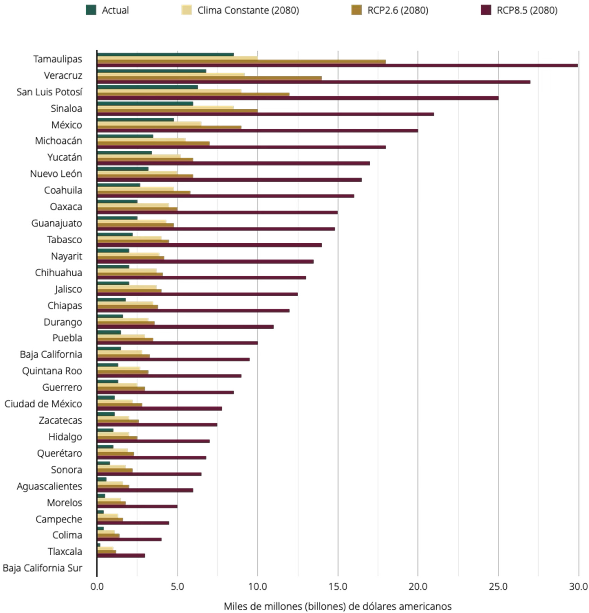 Nota: La proyección de daños económicos anuales por inundaciones fluviales al año 2080 bajo distintos escenarios RCP (Representative Concentration Pathways) evidencia un riesgo creciente y diferenciado por entidad federativa. Mientras en escenarios de mitigación (RCP 2.6) se estima un daño económico acotado, en trayectorias de altas emisiones (RCP 8.5) el impacto económico se multiplica, superando los 50 mil millones de pesos anuales en entidades altamente expuestas como Tamaulipas, Veracruz, San Luis Potosí, Sinaloa y México. Esta información refuerza la urgencia de integrar criterios prospectivos de riesgo climático y resiliencia hídrica en la planeación territorial. Se deberá responder mediante estrategias orientadas a la gestión del riesgo, el ordenamiento ecológico, la infraestructura verde-azul y la adaptación territorial al cambio climático. La integración del enfoque multiescalar de riesgo en los instrumentos de ordenamiento se vuelve estratégica para prevenir pérdidas, proteger medios de vida y reducir vulnerabilidades acumuladas.