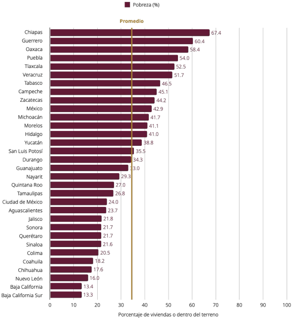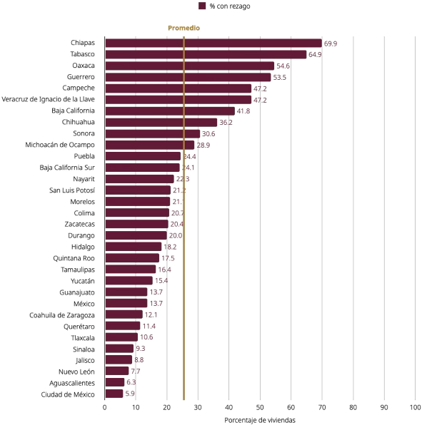 Nota: Se muestra una concentración crítica del rezago habitacional en el sur-sureste del país, destacando Chiapas (69.9%), Oaxaca (64.4%) y Guerrero (53.5%) como las entidades con mayores porcentajes, seguidas por Campeche, Tabasco y Baja California, lo que evidencia que el fenómeno no se restringe a contextos rurales, sino también afecta zonas urbanas con urbanización desigual y migración intensa. Esta distribución territorial refleja la intersección del rezago con pobreza multidimensional, exclusión financiera, déficit de infraestructura básica y ausencia de suelo regularizado, afectando especialmente a poblaciones indígenas, rurales y periurbanas. El dato refuerza la urgencia de territorializar la política habitacional, e integrar estrategias de producción social del hábitat, autoconstrucción asistida y acceso a suelo con servicios, con enfoque de derechos, género, interculturalidad y sostenibilidad.