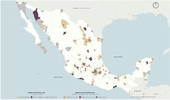 Nota: La configuración del SUN 2020 permite observar con claridad la distribución espacial de las 453 ciudades del país según su tamaño poblacional y el tipo de metrópoli al que pertenecen. Del total, 136 ciudades integran alguna de las 92 metrópolis reconocidas (48 zonas metropolitanas, 22 zonas conurbadas y 22 metrópolis municipales), lo que refleja una intensa concentración funcional del crecimiento urbano en determinados corredores regionales. Las ciudades fuera de metrópolis representan 70% de las localidades urbanas, lo que evidencia una importante dispersión y diversidad de dinámicas urbanas en escalas intermedias y menores. Esta jerarquía y tipología territorial resulta clave para el diseño diferenciado de políticas públicas de suelo, infraestructura, vivienda y movilidad, con especial atención a los rezagos estructurales en ciudades medias y pequeñas no integradas a sistemas metropolitanos.