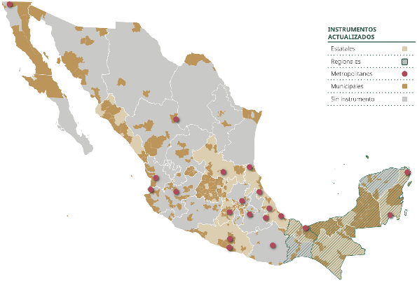 Nota: En 2024, menos de la mitad de las entidades federativas cuenta con instrumentos estatales actualizados de ordenamiento territorial (en beige), y solo tres regiones (sombreado) han avanzado hacia esquemas regionales integrados, pese a su reconocimiento en la LGAHOTDU. La cobertura municipal presenta una dispersión significativa, con vacíos normativos extensos en entidades del norte y zonas urbanas intermedias del Bajío y noreste del país. Los instrumentos metropolitanos (puntos rojos) son escasos y no corresponden plenamente con los nodos críticos del SUN ni con las regiones funcionales de mayor presión territorial. La alta proporción de municipios sin instrumento vigente (en gris) impide avanzar en la planeación del suelo y la gestión sostenible del territorio. Esta situación limita severamente la implementación del PNOTDU y la ENOT hacia 2040, y refleja una débil corresponsabilidad multinivel.