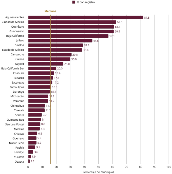 Nota: El número de Asentamientos Humanos Irregulares (AHI) reportados por entidad federativa presenta una alta concentración en 4 estados -Estado de México, Jalisco, Ciudad de México y Guanajuato- que en conjunto acumulan más de 50% del total nacional. No obstante, esta distribución debe leerse con cautela debido a la existencia de un subregistro estructural: en promedio, solo el 13.5 % de los municipios por entidad federativa reporta al INEGI, lo que distorsiona el panorama real de la informalidad urbana. Este vacío de información está asociado a limitaciones en capacidades técnicas, registros sistematizados y mecanismos institucionales homogéneos para la detección y monitoreo de asentamientos irregulares.