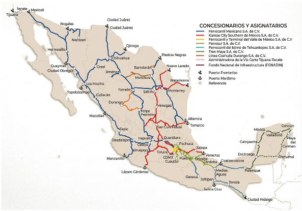 Nota: Se muestra la red troncal del sistema ferroviario concesionado y asignado a distintos operadores, así como su articulación con puertos marítimos y fronterizos. Esta infraestructura es estratégica para la reterritorialización de las cadenas logísticas, el fortalecimiento de los corredores de desarrollo y la integración económica con sentido soberano. El sistema ferroviario presenta una alta concentración en el norte y centro del país, especialmente en los corredores industriales y exportadores vinculados al T-MEC, lo que evidencia una lógica de desarrollo desequilibrado orientada a los mercados globales. En contraste, el sur-sureste ha sido históricamente marginado de estas infraestructuras, aunque recientemente se han incorporado corredores clave como el Corredor Interoceánico del Istmo de Tehuantepec (CIIT) y el Tren Maya, asignados a empresas públicas con enfoque de desarrollo regional. Esta reconfiguración representa una oportunidad para promover la conectividad territorial equitativa, el fortalecimiento de polos productivos para el bienestar y la inclusión de territorios históricamente rezagados. No obstante, persisten desafíos en la vinculación de estos corredores con sistemas urbanos secundarios, nodos logísticos intermodales, infraestructura social y cadenas de valor locales, así como en garantizar la participación comunitaria y el respeto a derechos territoriales.