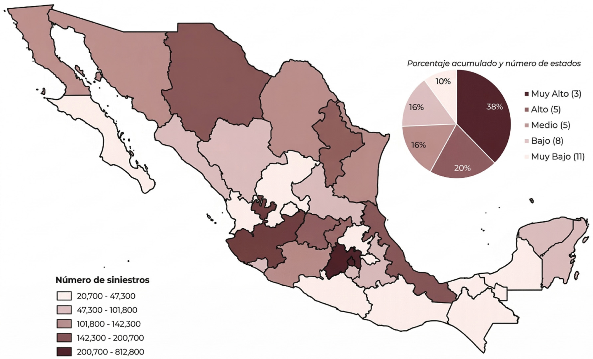 Nota: Se expone el número acumulado de siniestros de tránsito ocurridos en cada entidad federativa entre 2011 y 2021, clasificando el riesgo en cinco categorías. Destacan tres entidades con niveles muy altos de siniestros: Chihuahua, Jalisco y Nuevo León, que concentran 38% del total nacional. Esto refleja una alta exposición al riesgo vial en contextos metropolitanos densamente urbanizados y motorizados. Les siguen otras cinco entidades con niveles altos, ubicadas principalmente en el centro y norte del país. En contraste, 11 entidades presentan niveles muy bajos, la mayoría de ellas con baja densidad urbana o predominio rural, aunque esta menor incidencia puede estar influida también por un subregistro en el reporte de accidentes viales. El patrón territorial sugiere una correlación entre la concentración poblacional, la motorización privada, la carencia de infraestructura vial segura y la falta de sistemas de transporte público masivo con seguridad vial. La concentración de siniestros en los nodos del sistema urbano nacional subraya la urgencia de implementar estrategias de movilidad segura y sustentable en zonas metropolitanas y urbanas intermedias. Esto implica adoptar el enfoque de Visión Cero, rediseñar entornos urbanos bajo principios de urbanismo táctico y equidad vial, y fortalecer los sistemas de datos e inteligencia territorial para la prevención de siniestros.