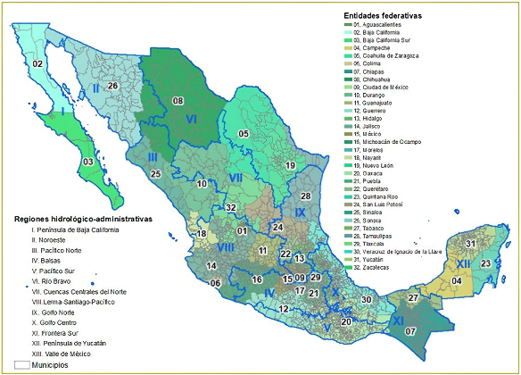 Mapa 10. Regiones hidrológico-administrativas, entidades federativas y municipios de México (2022)