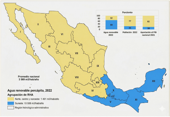 Nota: Se ilustra la desigualdad territorial entre disponibilidad de agua renovable, distribución poblacional y aportación al PIB nacional, al contrastar las regiones hidrológicas del sureste, que concentran 68% del agua disponible en el país, con el norte, centro y noroeste, donde habita 77% de la población y se genera 82% del PIB nacional, a pesar de contar con apenas 32% del recurso hídrico. Esta asimetría estructural revela un patrón de desequilibrio histórico que tensiona la gestión del agua, el ordenamiento territorial y los modelos de desarrollo regional, ya que las regiones de mayor concentración demográfica y económica operan en contextos de estrés hídrico creciente. La evidencia refuerza la necesidad de reconfigurar las políticas públicas hacia una justicia hídrica y territorial que reconozca los límites ecológicos, garantice el derecho humano al agua y promueva una redistribución territorial más equitativa de las oportunidades de bienestar, inversión e infraestructura.