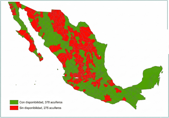 Nota: Se expone la extensión de acuíferos sobreexplotados en México, con 275 unidades sin disponibilidad de agua subterránea (representadas en rojo), que se concentran principalmente en las regiones centro-norte, occidente y noroeste del país, justamente donde se localizan los mayores núcleos urbanos, agroindustrias y polos de desarrollo económico. Esta distribución refleja un patrón de sobreexplotación hídrica en zonas densamente pobladas o de alta demanda productiva, que contrasta con la mayor disponibilidad observada en el sureste y algunas zonas del altiplano sur. La cartografía pone en evidencia la presión sobre los acuíferos, muchos de los cuales constituyen la única fuente de abasto en regiones áridas, y subraya la urgencia de un reordenamiento territorial que priorice la gestión integral de cuencas, la justicia hídrica interregional y el cambio de paradigma hacia un desarrollo equilibrado, resiliente y sustentable.