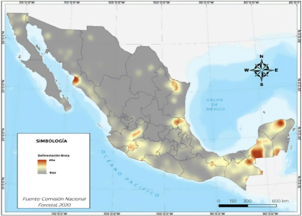 Nota: Se identifica las zonas críticas de deforestación bruta en México entre 2001 y 2018, destacando regiones de alta pérdida de cobertura forestal en la península de Yucatán, los límites entre Chiapas y Oaxaca, la región de Tierra Caliente entre Michoacán y Guerrero, la Sierra Madre Occidental en Nayarit y Sinaloa, así como focos aislados en Jalisco, Veracruz y Tabasco. Estas áreas coinciden con territorios de alta biodiversidad, presencia de pueblos indígenas y expansión agroindustrial, lo que evidencia la convergencia entre presión productiva, debilidad institucional y carencias en ordenamiento ecológico. La intensidad y persistencia del fenómeno reflejan no sólo la magnitud del deterioro ambiental, sino también la urgencia de articular políticas territoriales de restauración, gobernanza ambiental participativa y justicia socioecológica.