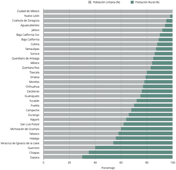 4 Más información, ver: Cuadro 08. Distribución de la población por entidad federativa y grado de marginación (2020); Gráfico 06. Porcentaje de viviendas con rezago habitacional por entidad federativa (2022); Gráfico 11. Porcentaje viviendas propias o que se están pagando, que no cuentan con escrituras (2022); Cuadro 09. Distribución de la población urbana y rural por entidad federativa e índice de marginación (2020); y Gráfico 17. Distribución porcentual de personas sujetas agrarias por sexo y entidad federativa (2023).