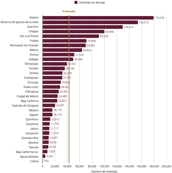 Nota: La distribución territorial del rezago en conexión a drenaje refleja brechas estructurales persistentes en entidades como Chiapas, Oaxaca y Veracruz, donde más de 100 mil viviendas carecen de este servicio básico. Esta carencia impacta la salud, el ambiente y la dignidad de vida, y se relaciona con patrones históricos de marginación, dispersión poblacional y ausencia de planeación territorial. Se deberá priorizar el cierre de estas brechas mediante infraestructura básica con enfoque de justicia territorial y sostenibilidad hídrica, articulando la inversión pública con criterios de equidad espacial y bienestar colectivo.