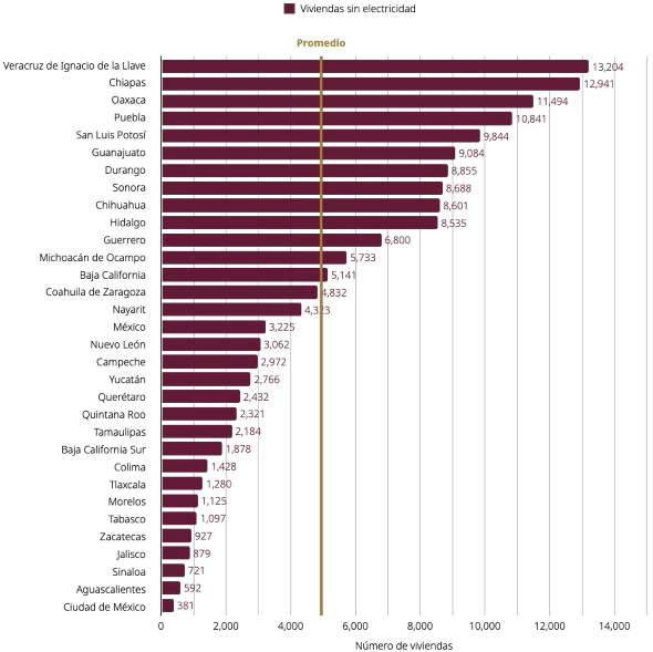 Nota: En 2022, más de 13 mil viviendas en Chiapas y casi 13 mil en Oaxaca carecían de acceso a electricidad, revelando un patrón de exclusión territorial fuertemente concentrado en el sur del país. Estas carencias limitan el ejercicio de derechos fundamentales, impiden el acceso equitativo a tecnologías y servicios básicos, y agravan la pobreza energética. Se impulsarán estrategias de electrificación con pertinencia territorial, priorizando a comunidades rurales, indígenas y dispersas mediante soluciones descentralizadas, sostenibles y articuladas con el bienestar socioambiental.