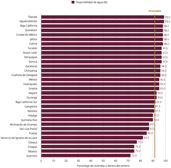 Nota: Aunque el promedio nacional de disponibilidad de agua en la vivienda o el terreno alcanza el 93 %, persisten rezagos críticos en entidades como Chiapas (72 %), Guerrero (75 %) y Oaxaca (75 %). Esta desigualdad territorial en el acceso al agua refleja brechas estructurales en infraestructura básica y gobernanza hídrica, especialmente en zonas rurales, indígenas y marginadas. Se deberá impulsar la equidad hídrica mediante inversiones diferenciadas, gestión comunitaria del recurso, y planificación territorial orientada al derecho humano al agua y la sostenibilidad de los ecosistemas.