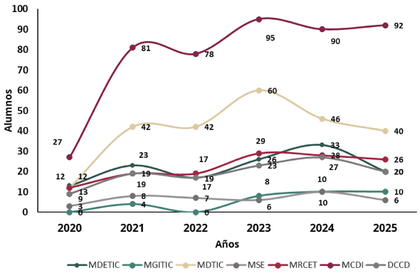 | Método de cálculo | ((Número de personas matriculadas en Programas de Educación Superior de INFOTEC acumuladas hasta el periodo t/ Número de personas matriculadas en los programas académicos o de formación tecnológica de INFOTEC en el año 2025) -1) x100 |