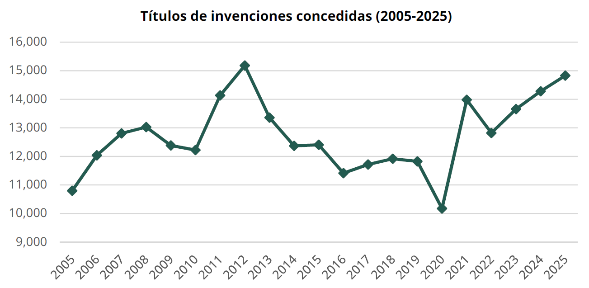 La protección a la propiedad industrial ha cobrado una gran importancia en México. Una muestra clara es la evolución de los títulos de invenciones otorgados en los últimos 20 años, pasando de 10,795 en 2005 a 14,828 en 2025, de los cuales 10,840 corresponden a patentes, 367 a registros de modelos de utilidad, 3,619 a registros de diseños industriales y dos a trazados de circuito integrado. De esta cifra general, 1,963 títulos pertenecen a solicitantes nacionales y el resto a personas solicitantes extranjeras. Lo anterior, representa un incremento de 37% en el otorgamiento de títulos de invenciones(1).