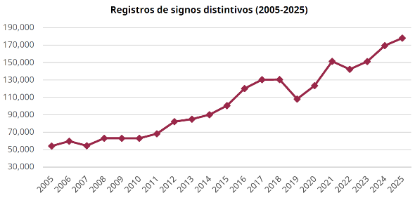 Esta evolución es aún más notable en signos distintivos que registraron un crecimiento de 229% en las últimas dos décadas. En 2005, se otorgaron 54,154 registros y en 2025, 178,072, de los cuales 128,570 pertenecen a titulares nacionales: 124,403 corresponden a marcas, 4,149 a avisos comerciales y 18 a nombres comerciales(4).