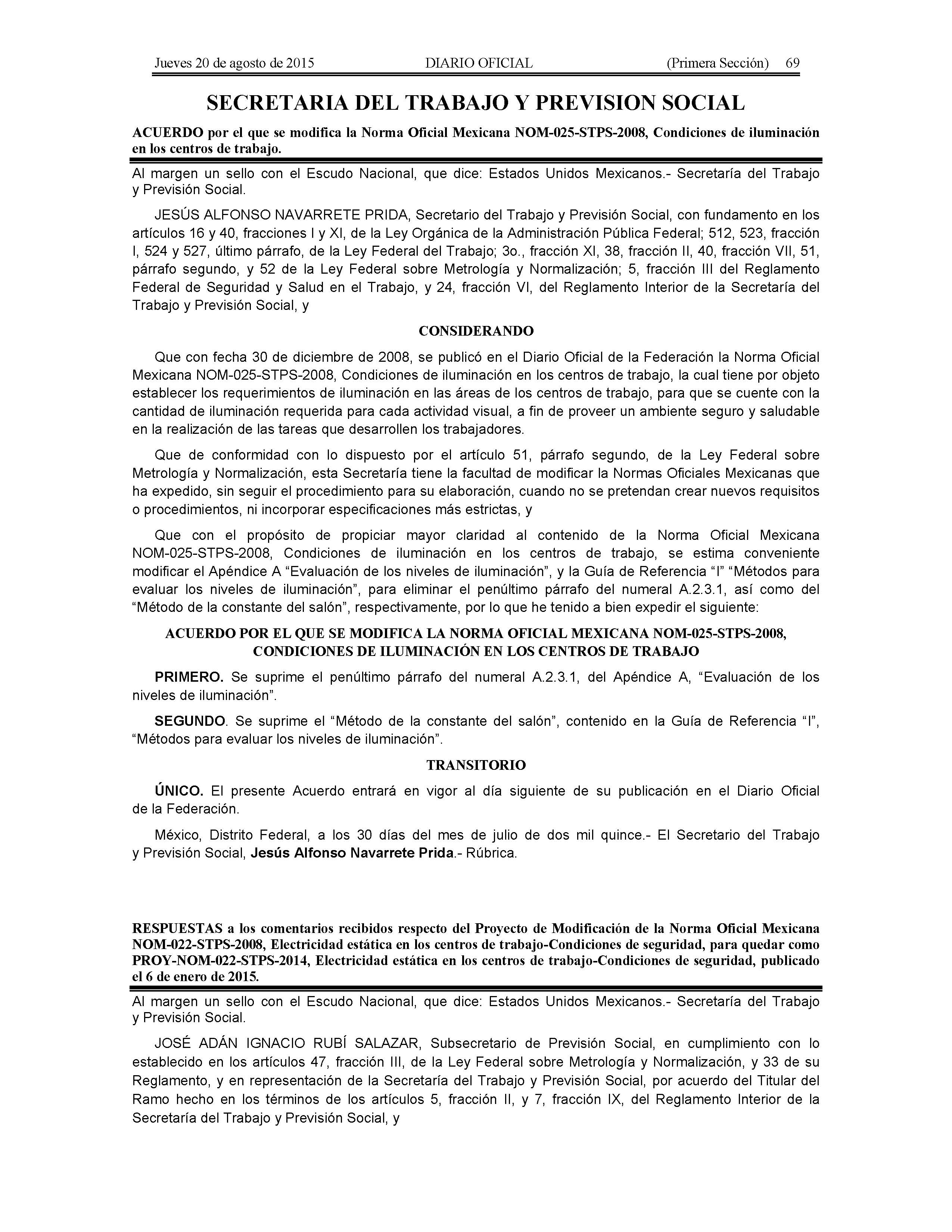 Acuerdo por el que se modifica la Norma Oficial Mexicana NOM-025- STPS-2008, Condiciones de iluminación en los centros de trabajo