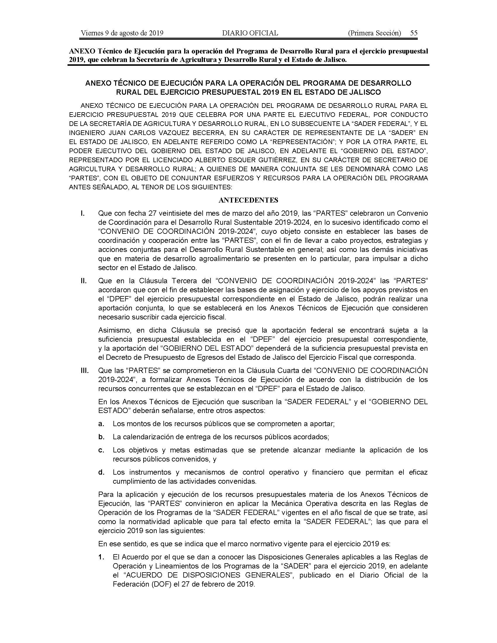 Anexo Técnico de Ejecución para la operación del Programa de Desarrollo Rural para el ejercicio presupuestal 2019, que celebran la Secretaría de Agricultura y Desarrollo Rural y el Estado de Jalisco.