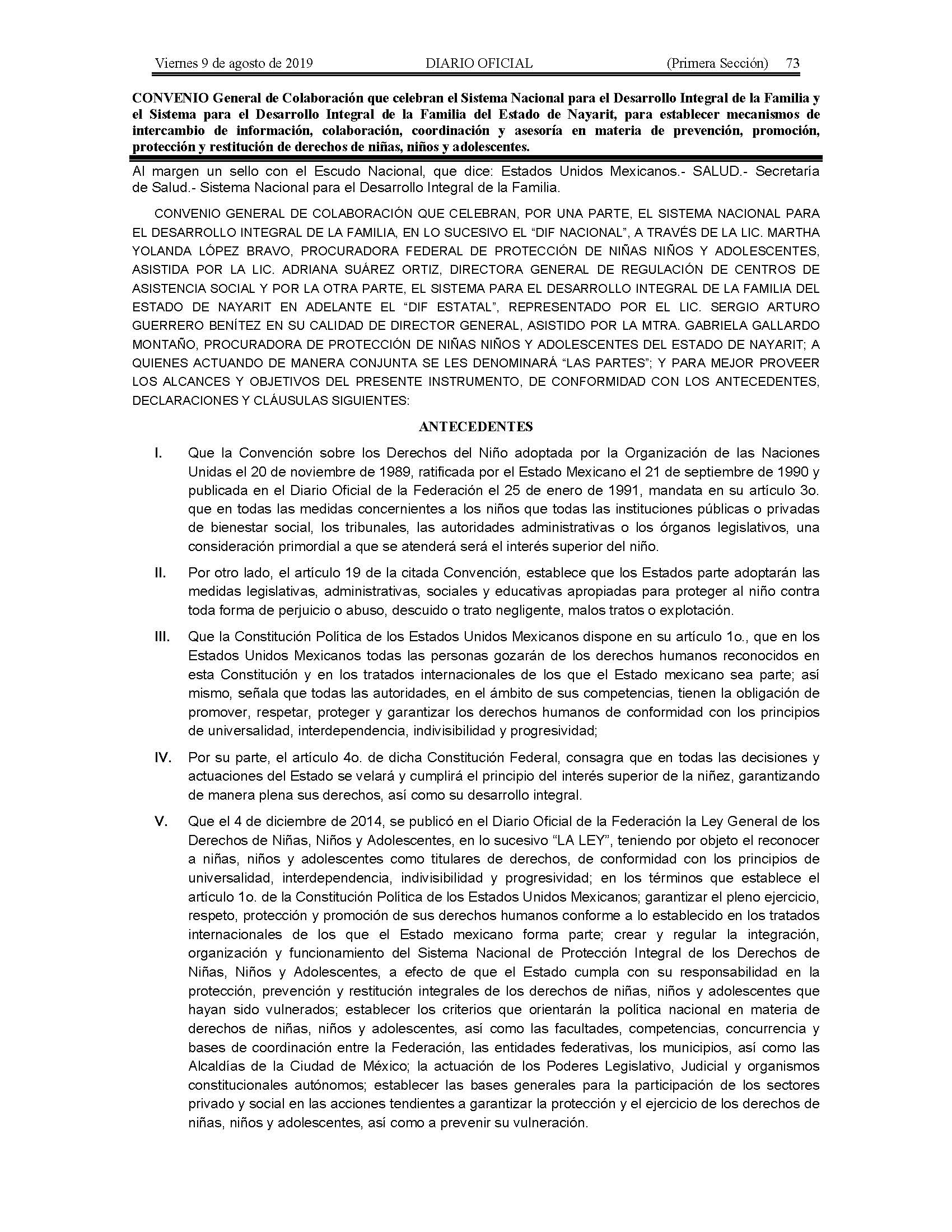 Convenio General de Colaboración que celebran el Sistema Nacional para el Desarrollo Integral de la Familia y el Sistema para el Desarrollo Integral de la Familia del Estado de Nayarit, para establecer mecanismos de intercambio de información, colaboración, coordinación y asesoría en materia de prevención, promoción, protección y restitución de derechos de niñas, niños y adolescentes.