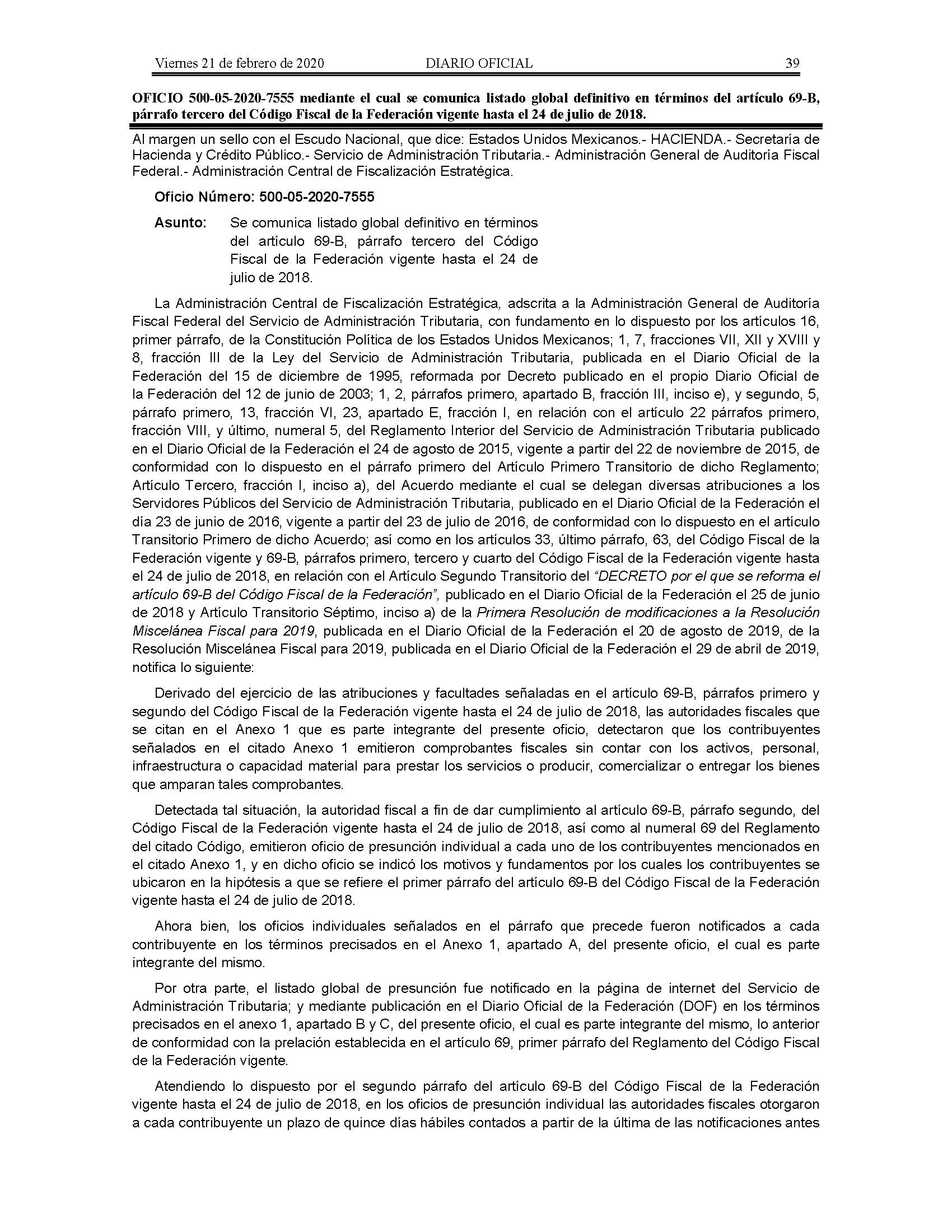 Oficio 500-05-2020-7555 mediante el cual se comunica listado global definitivo en términos del artículo 69-B, párrafo tercero del Código Fiscal de la Federación vigente hasta el 24 de julio de 2018.