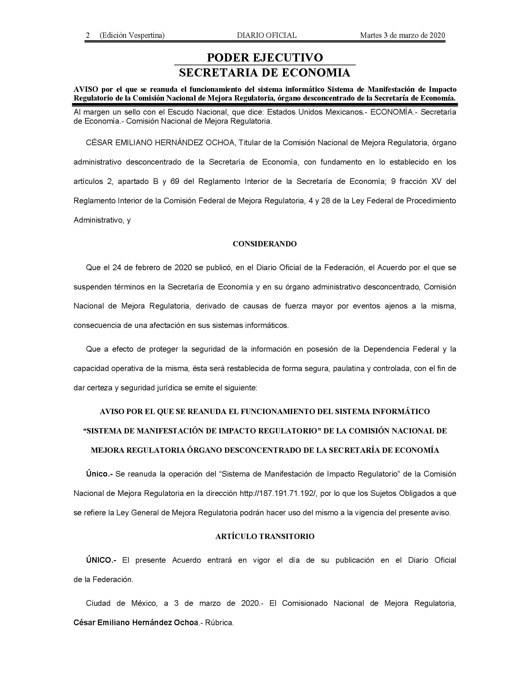 Aviso por el que se reanuda el funcionamiento del sistema informático Sistema de Manifestación de Impacto Regulatorio de la Comisión Nacional de Mejora Regulatoria, órgano desconcentrado de la Secretaría de Economía.