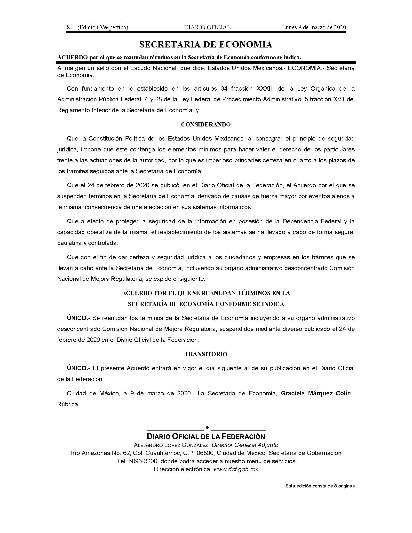 Acuerdo por el que se reanudan términos en la Secretaría de Economía conforme se indica.