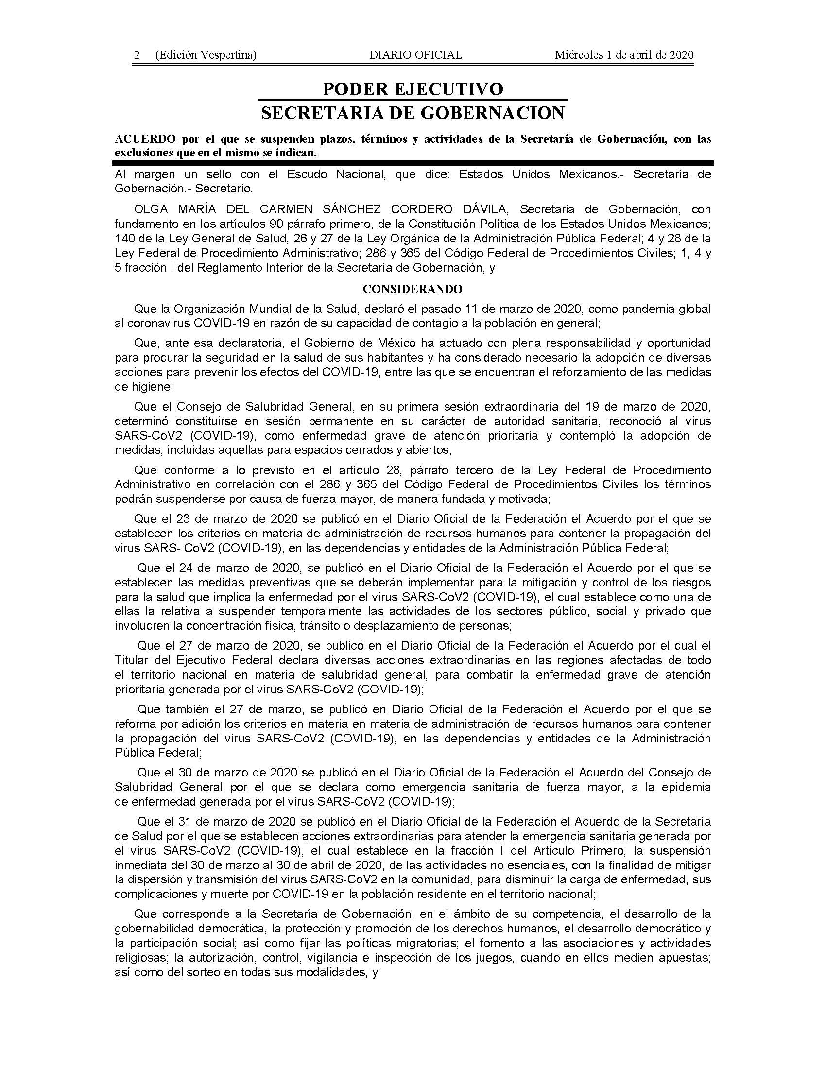 Acuerdo por el que se suspenden plazos, términos y actividades de la Secretaría de Gobernación, con las exclusiones que en el mismo se indican.