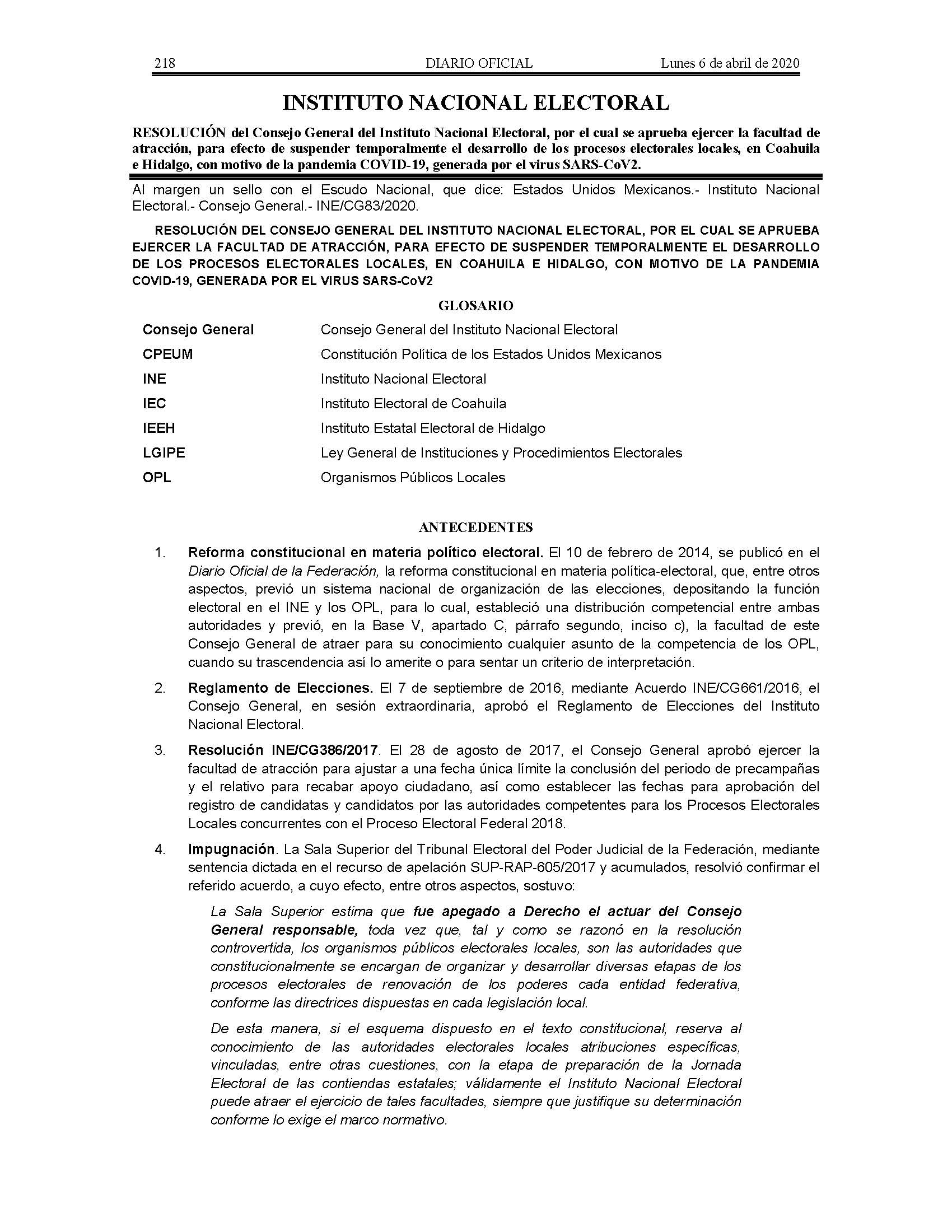 Resolución del Consejo General del Instituto Nacional Electoral, por el cual se aprueba ejercer la facultad de atracción, para efecto de suspender temporalmente el desarrollo de los procesos electorales locales, en Coahuila e Hidalgo, con motivo de la pandemia COVID-19, generada por el virus SARS-CoV2.