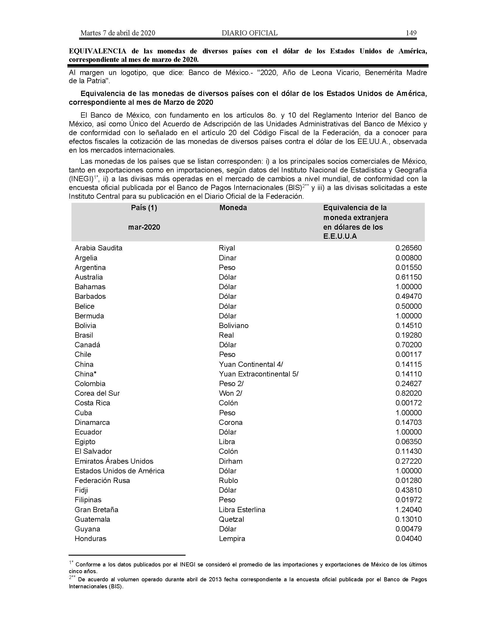 Equivalencia de las monedas de diversos países con el dólar de los Estados Unidos de América, correspondiente al mes de marzo de 2020.