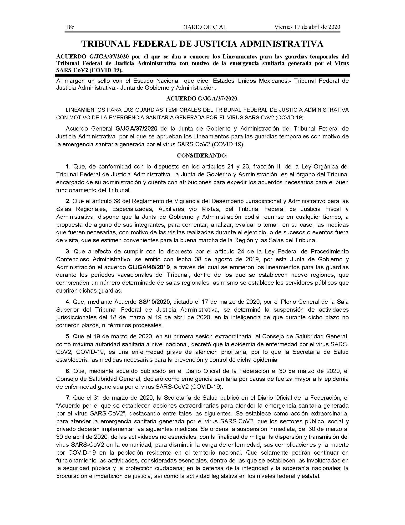 Acuerdo G/JGA/37/2020 por el que se dan a conocer los Lineamientos para las guardias temporales del Tribunal Federal de Justicia Administrativa con motivo de la emergencia sanitaria generada por el Virus SARS-CoV2 (COVID-19).