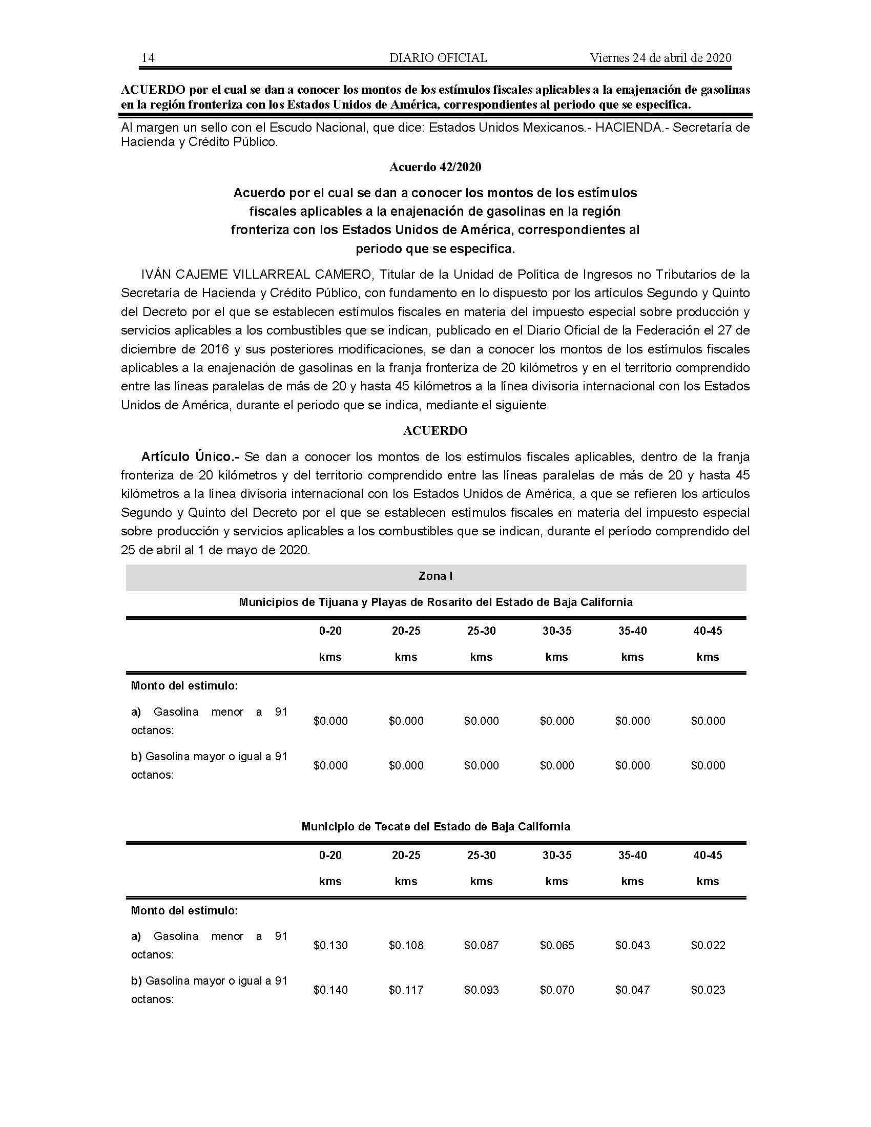 Acuerdo por el cual se dan a conocer los montos de los estímulos fiscales aplicables a la enajenación de gasolinas en la región fronteriza con los Estados Unidos de América, correspondientes al periodo que se especifica.