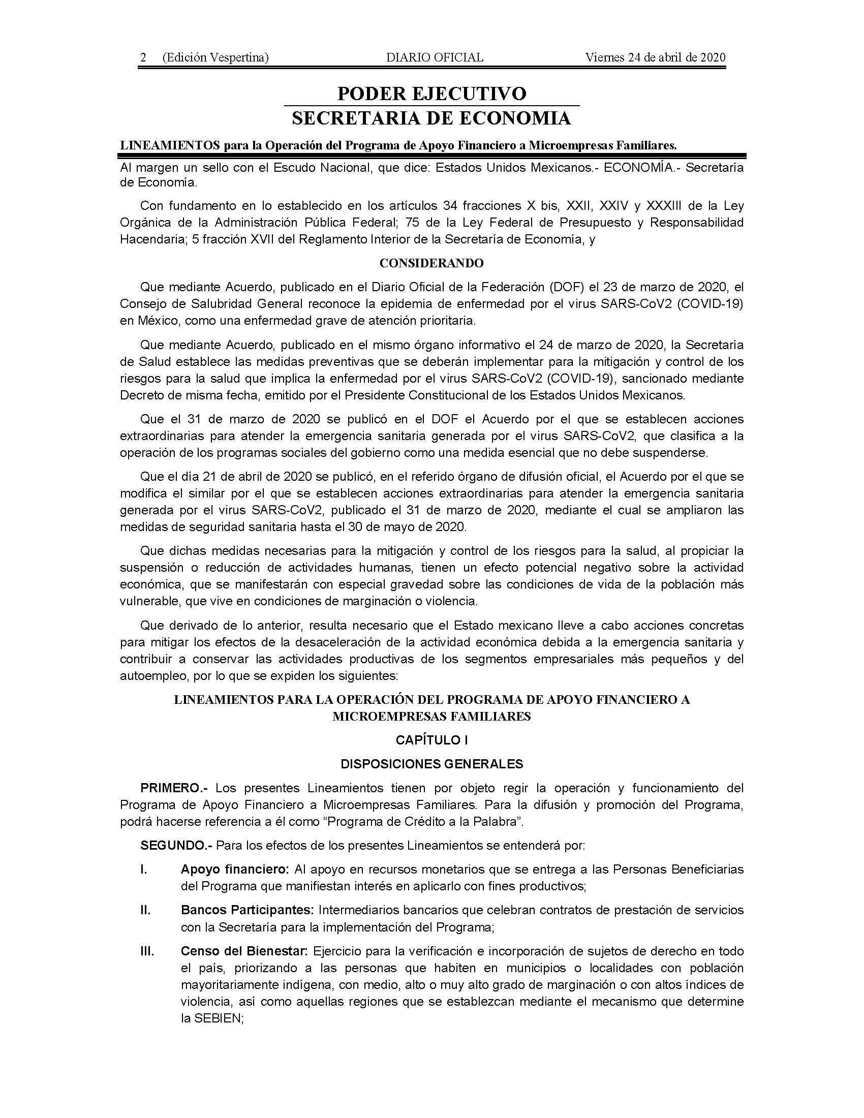 Lineamientos para la Operación del Programa de Apoyo Financiero a Microempresas Familiares.