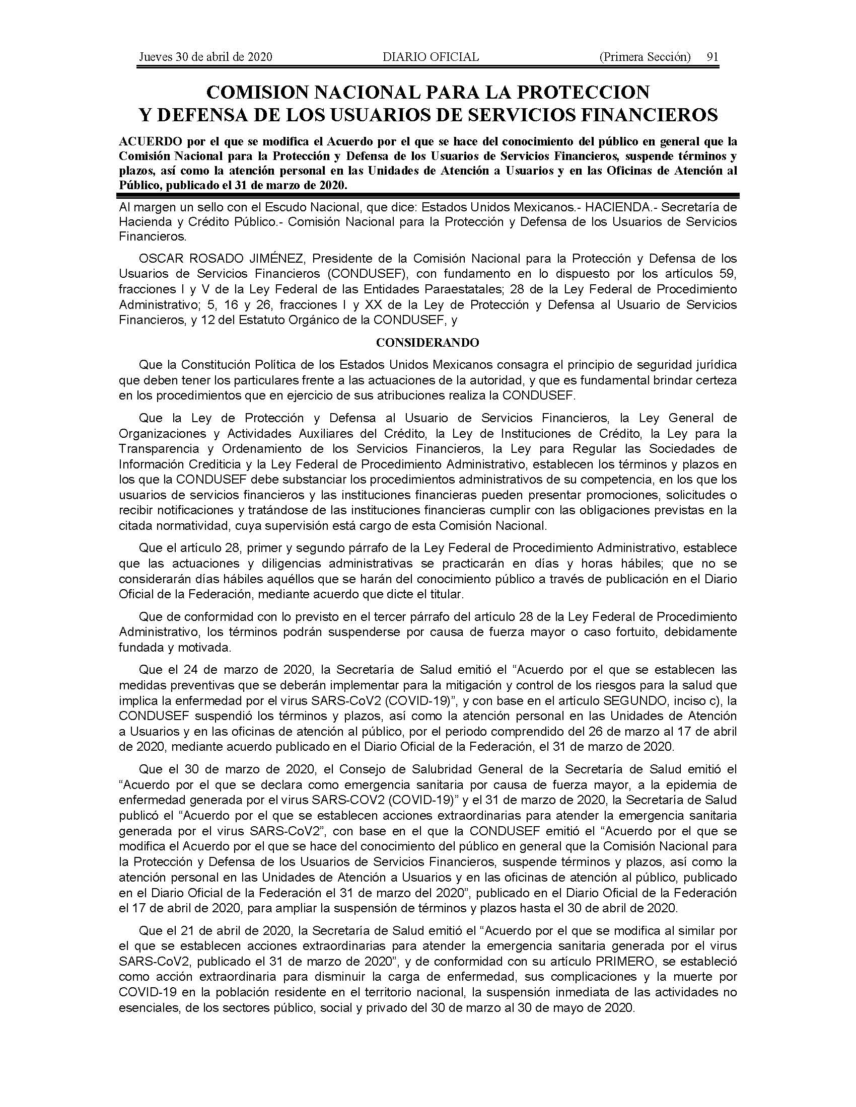Acuerdo por el que se modifica el Acuerdo por el que se hace del conocimiento del público en general que la Comisión Nacional para la Protección y Defensa de los Usuarios de Servicios Financieros, suspende términos y plazos, así como la atención personal en las Unidades de Atención a Usuarios y en las Oficinas de Atención al Público, publicado el 31 de marzo de 2020.