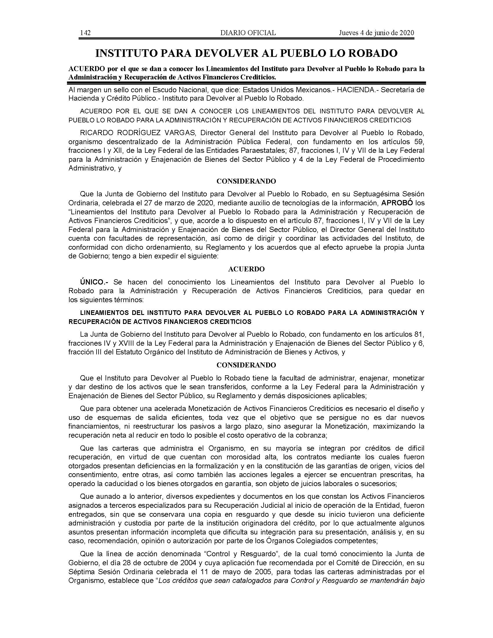 Acuerdo por el que se dan a conocer los Lineamientos del Instituto para Devolver al Pueblo lo Robado para la Administración y Recuperación de Activos Financieros Crediticios.