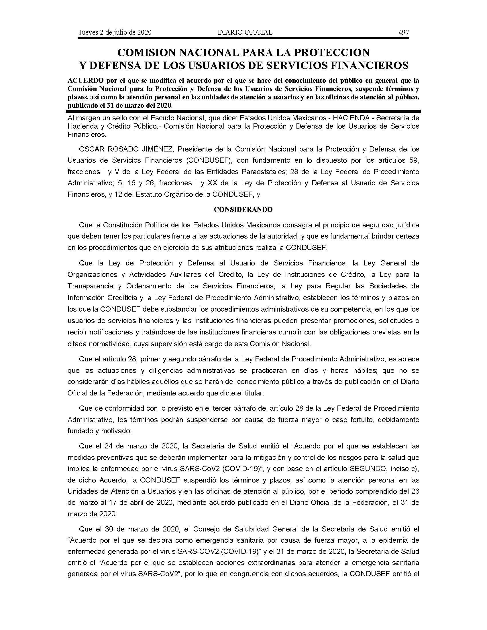 Acuerdo por el que se modifica el acuerdo por el que se hace del conocimiento del público en general que la Comisión Nacional para la Protección y Defensa de los Usuarios de Servicios Financieros, suspende términos y plazos, así como la atención personal en las unidades de atención a usuarios y en las oficinas de atención al público, publicado el 31 de marzo del 2020.