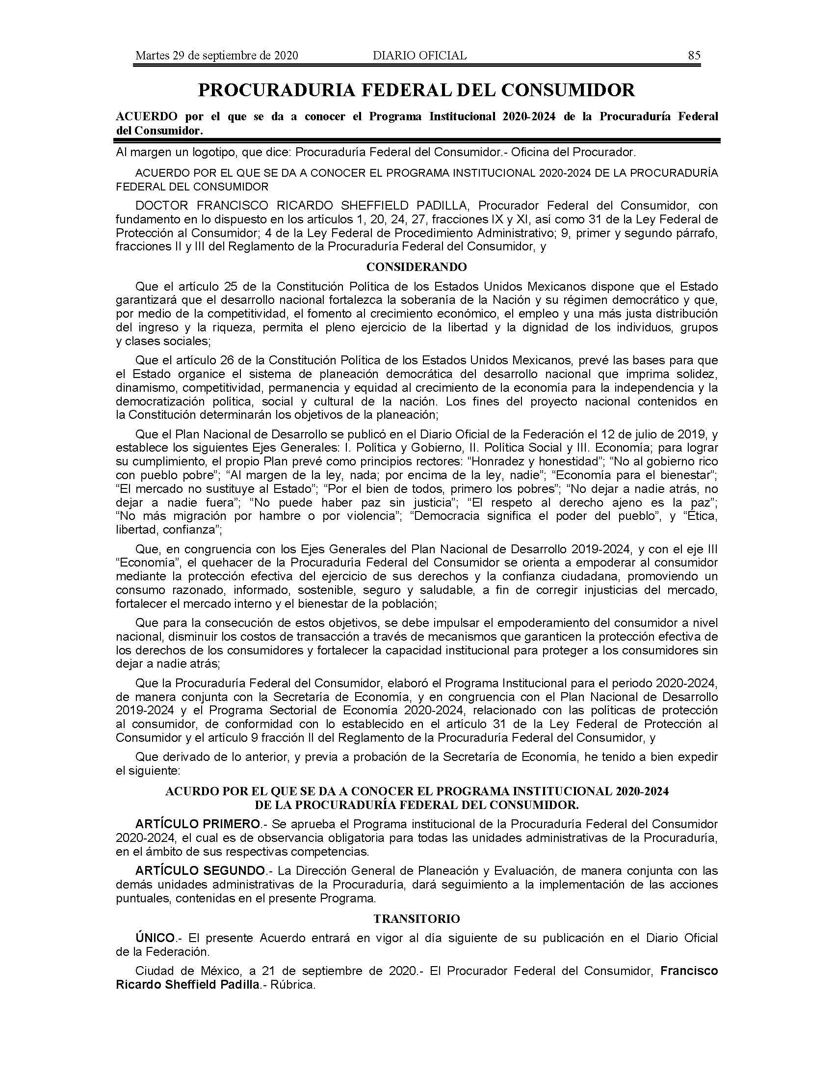 Acuerdo por el que se da a conocer el Programa Institucional 2020-2024 de la Procuraduría Federal del Consumidor.