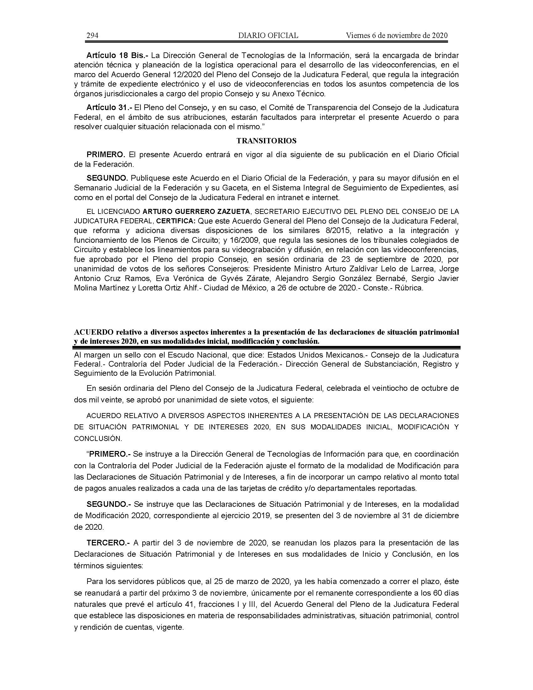 Acuerdo relativo a diversos aspectos inherentes a la presentación de las declaraciones de situación patrimonial y de intereses 2020, en sus modalidades inicial, modificación y conclusión.