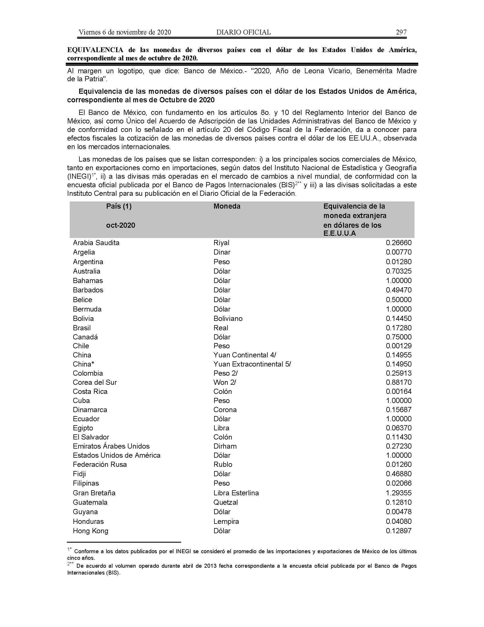 Equivalencia de las monedas de diversos países con el dólar de los Estados Unidos de América, correspondiente al mes de octubre de 2020.