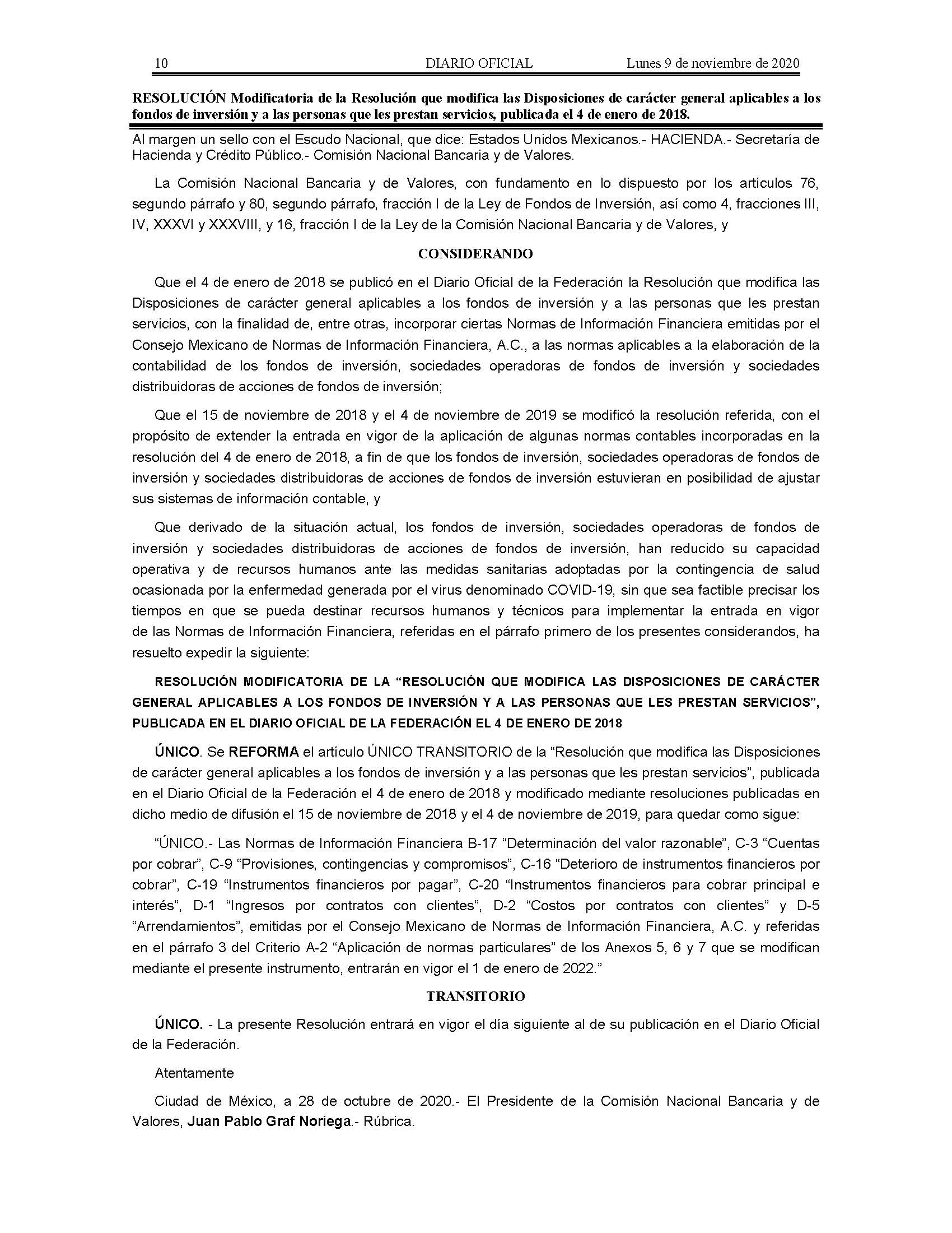 Resolución Modificatoria de la Resolución que modifica las Disposiciones de carácter general aplicables a los fondos de inversión y a las personas que les prestan servicios, publicada el 4 de enero de 2018.
