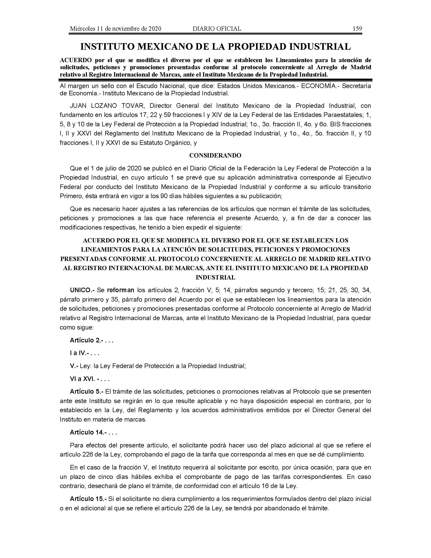 Acuerdo por el que se modifica el diverso por el que se establecen los Lineamientos para la atención de solicitudes, peticiones y promociones presentadas conforme al protocolo concerniente al Arreglo de Madrid relativo al Registro Internacional de Marcas, ante el Instituto Mexicano de la Propiedad Industrial.