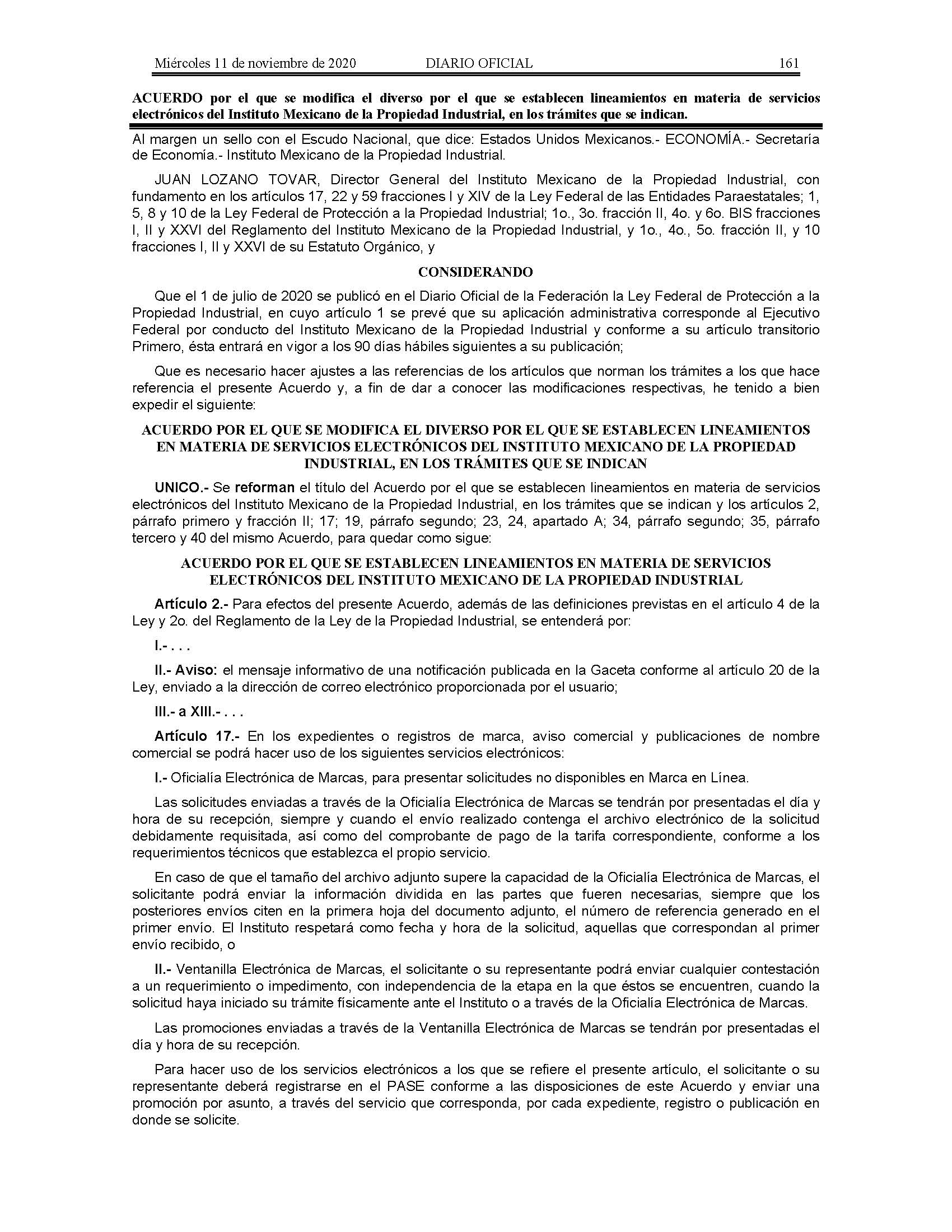 Acuerdo por el que se modifica el diverso por el que se establecen lineamientos en materia de servicios electrónicos del Instituto Mexicano de la Propiedad Industrial, en los trámites que se indican.