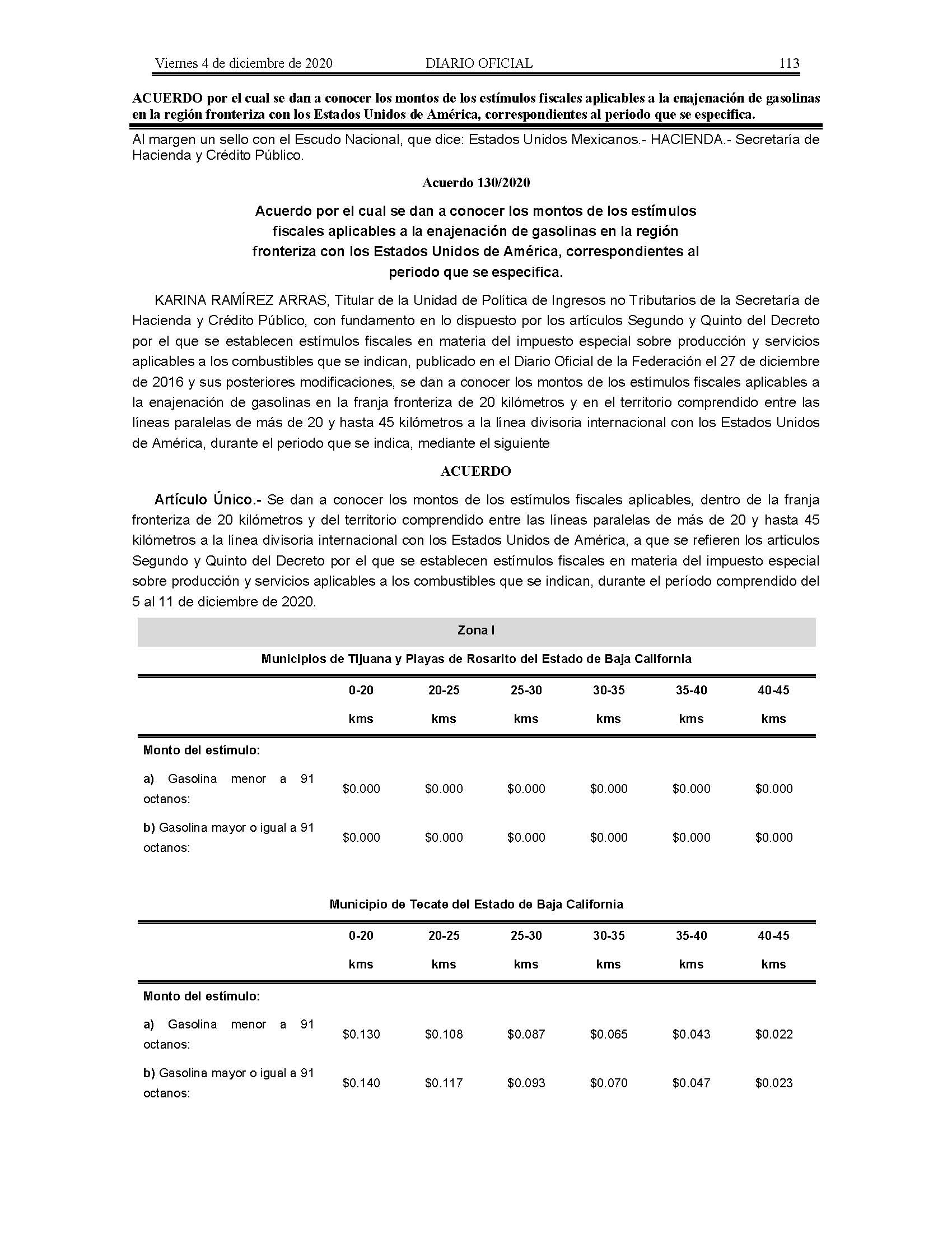 Acuerdo por el cual se dan a conocer los montos de los estímulos fiscales aplicables a la enajenación de gasolinas en la región fronteriza con los Estados Unidos de América, correspondientes al periodo que se especifica.