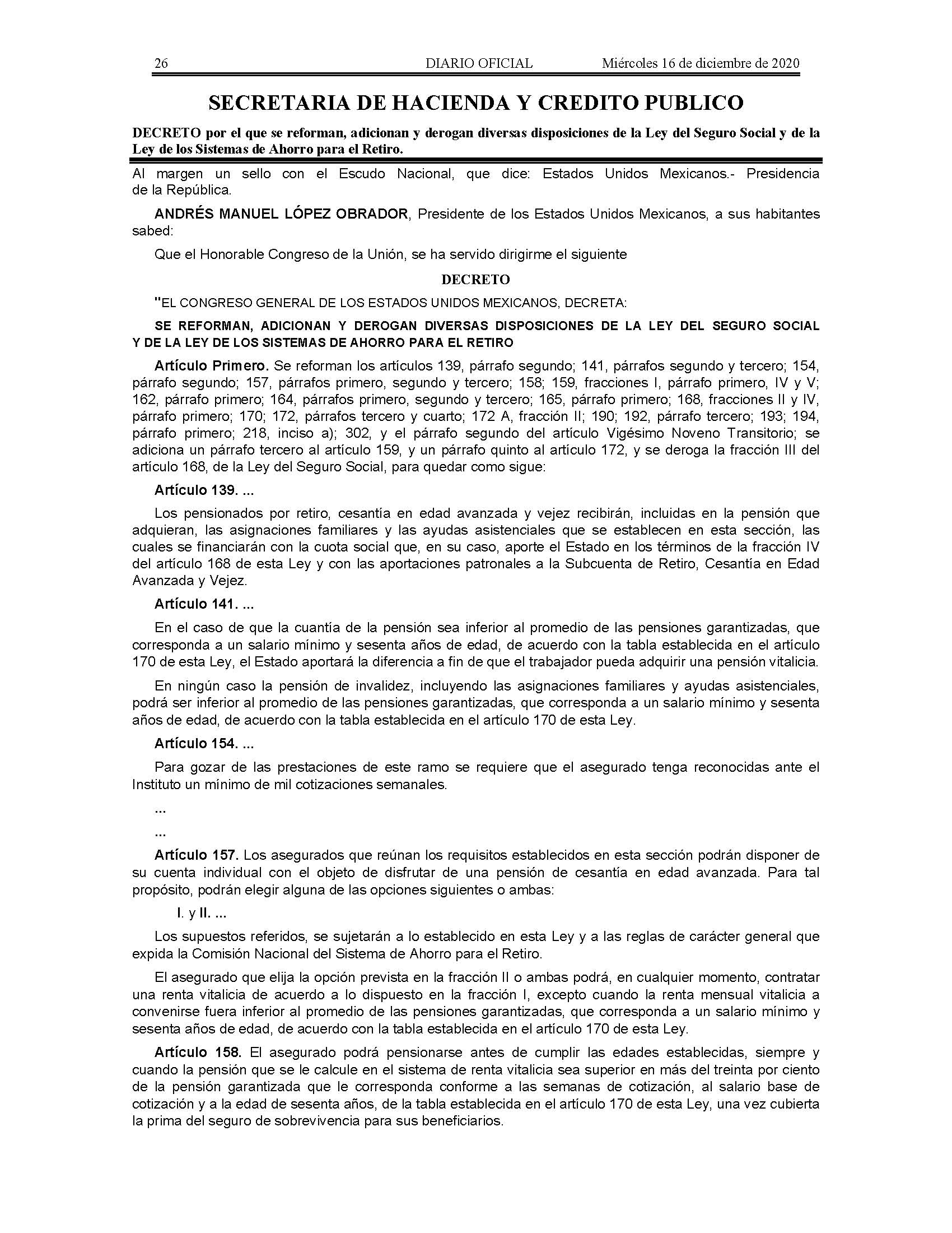 Decreto por el que se reforman, adicionan y derogan diversas disposiciones de la Ley del Seguro Social y de la Ley de los Sistemas de Ahorro para el Retiro.